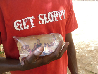 A recurring theme in the series Les souvenirs are the water-filled plastic bags that are sold everywhere along the roads in Mali. In these bags Camara has inserted photographs of friends, playing with the effects of water distortion and reflections. The slideshows in the bags create a sort of narrative link between the photographs. In Bamako people are constantly on the move from one place to another. A photograph is a tool to arrest and capture these moments. Camara’s photographs talk about memories by projecting images of friends who carry and bring them out in these pearlescent water bags.